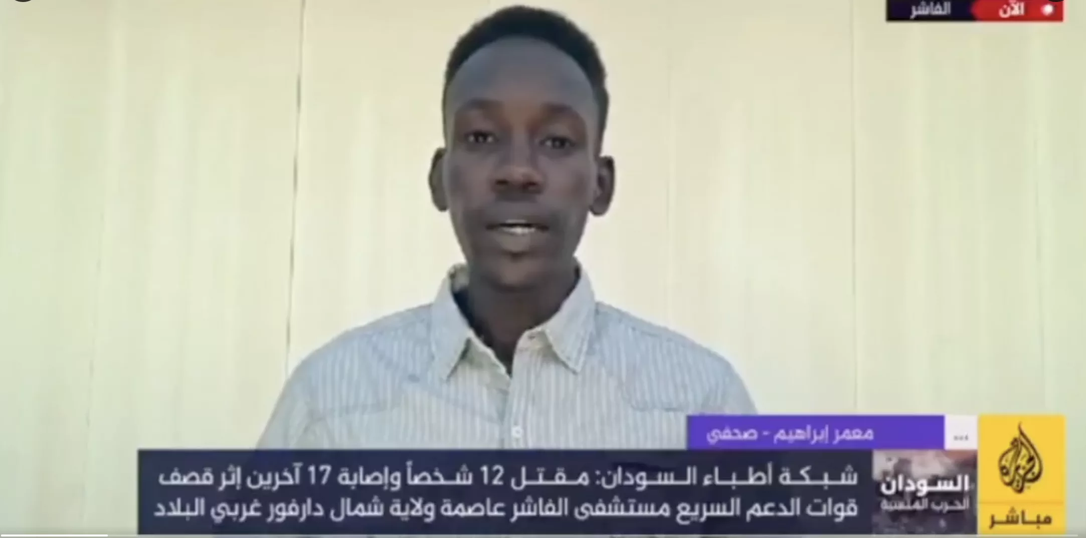 رصدت “لجنة العدالة” اعتقال قوات الدعم السريع لخمسة صحفيين من مدينة الفاشر، عاصمة شمال دارفور، عقب سيطرتها على المدينة، من بينهم الصحفي المتعاون مع قناة الجزيرة معمر إبراهيم. كما أكدت نقابة الصحفيين فقدان الاتصال مع سبعة صحفيين آخرين، بينهم صحافيتان، منذ سيطرة قوات الدعم السريع على المدينة، مشيرة إلى أن الصحفيين كانوا يتواجدون في المدينة ومخيم “أبو شوك” للنازحين أثناء المواجهات التي اندلعت بين الجيش وقوات الدعم السريع. وظهر في مقطع فيديو المصور الصحفي إبراهيم جبريل بابو بين الأسرى والمعتقلين الذين تحتجزهم قوات الدعم السريع، ما يرجح تعرضه للاعتقال من قبل هذه القوات.