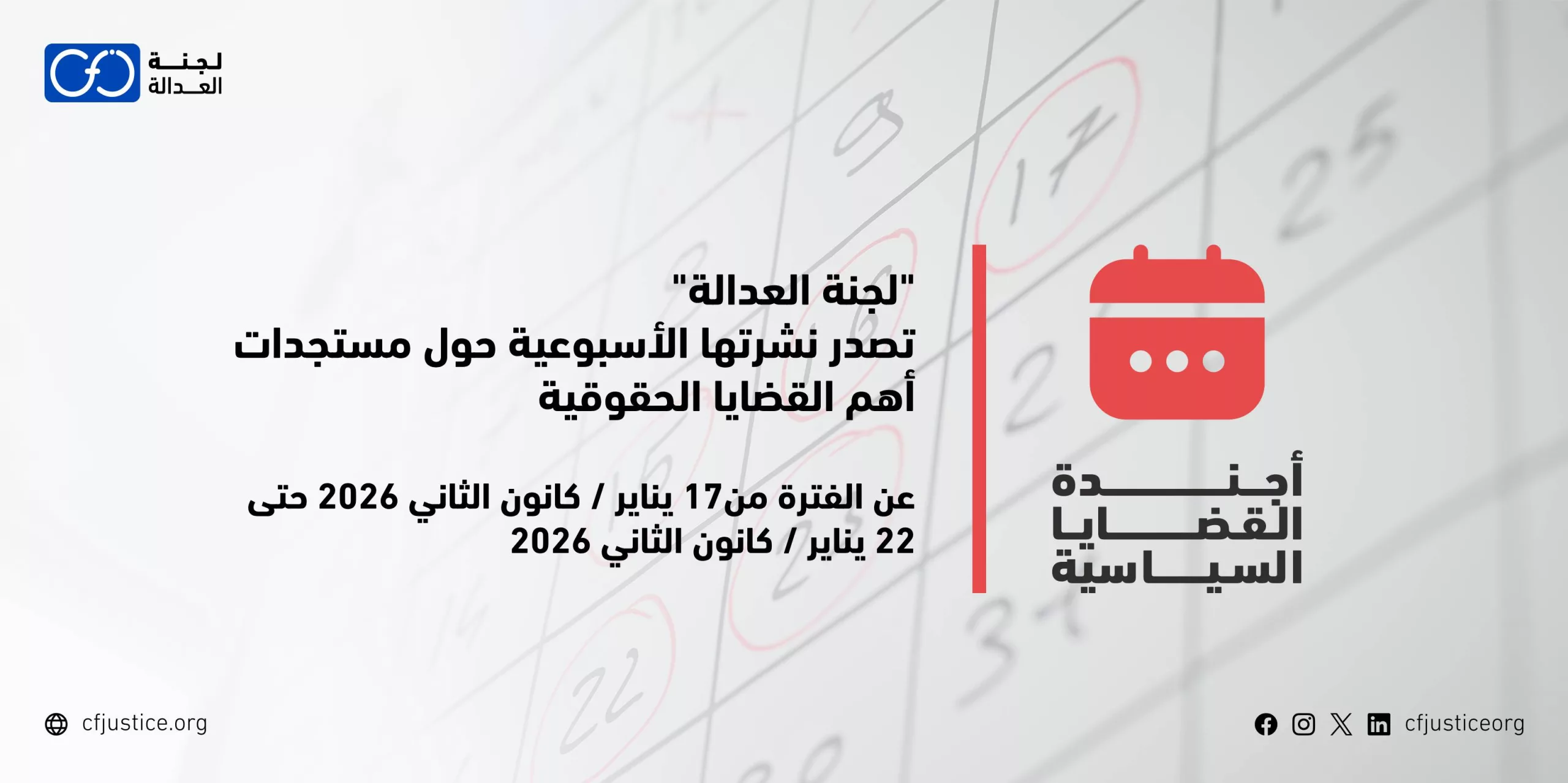 في إطار متابعتها المستمرة للوضع القانوني المرتبط بالقضايا الحقوقية الهامة في مصر، تصدر “لجنة العدالة” نشرتها الأسبوعية الخاصة بمستجدات أهم القضايا في الأسبوع، والمنشورة عبر أجندتها للقضايا السياسية، والتي دشنتها لتسهيل عملية البحث عن تواريخ انعقاد جلسات القضايا الحقوقية وأحدث تطوراتها بشكل مبسط يسهل الوصول إليه، وذلك عن الفترة من 17 يناير / كانون الثاني 2026 حتى 22 يناير / كانون الثاني 2026؛ والتي كانت كالآتي: