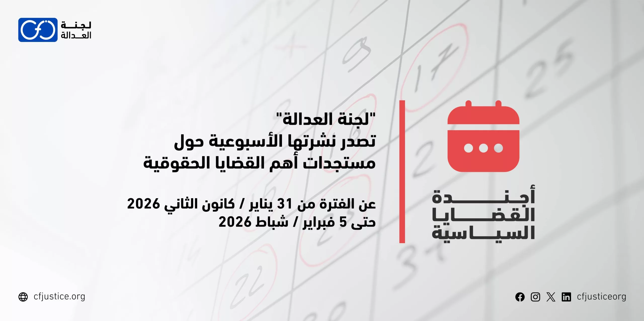 في إطار متابعتها المستمرة للوضع القانوني المرتبط بالقضايا الحقوقية الهامة في مصر، تصدر “لجنة العدالة” نشرتها الأسبوعية الخاصة بمستجدات أهم القضايا في الأسبوع، والمنشورة عبر أجندتها للقضايا السياسية، والتي دشنتها لتسهيل عملية البحث عن تواريخ انعقاد جلسات القضايا الحقوقية وأحدث تطوراتها بشكل مبسط يسهل الوصول إليه، وذلك عن الفترة من 31 يناير / كانون الثاني 2026 حتى 5 فبراير / شباط 2026؛ والتي كانت كالآتي: