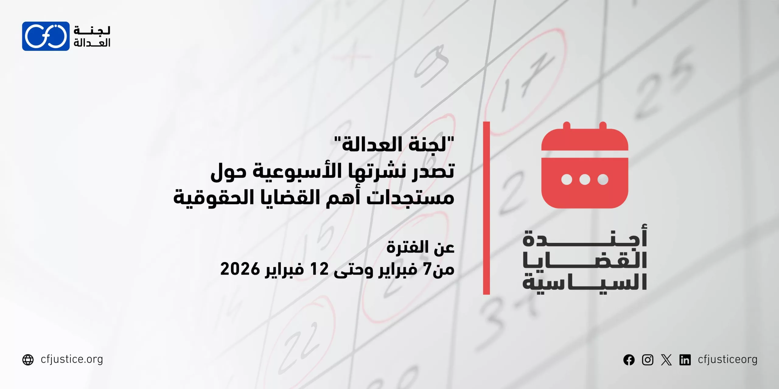 في إطار متابعتها المستمرة للوضع القانوني المرتبط بالقضايا الحقوقية الهامة في مصر، تصدر “لجنة العدالة” نشرتها الأسبوعية الخاصة بمستجدات أهم القضايا في الأسبوع، والمنشورة عبر أجندتها للقضايا السياسية، والتي دشنتها لتسهيل عملية البحث عن تواريخ انعقاد جلسات القضايا الحقوقية وأحدث تطوراتها بشكل مبسط يسهل الوصول إليه، وذلك عن الفترة من 7 فبراير / شباط 2026 حتى 12 فبراير / شباط 2026؛ والتي كانت كالآتي: