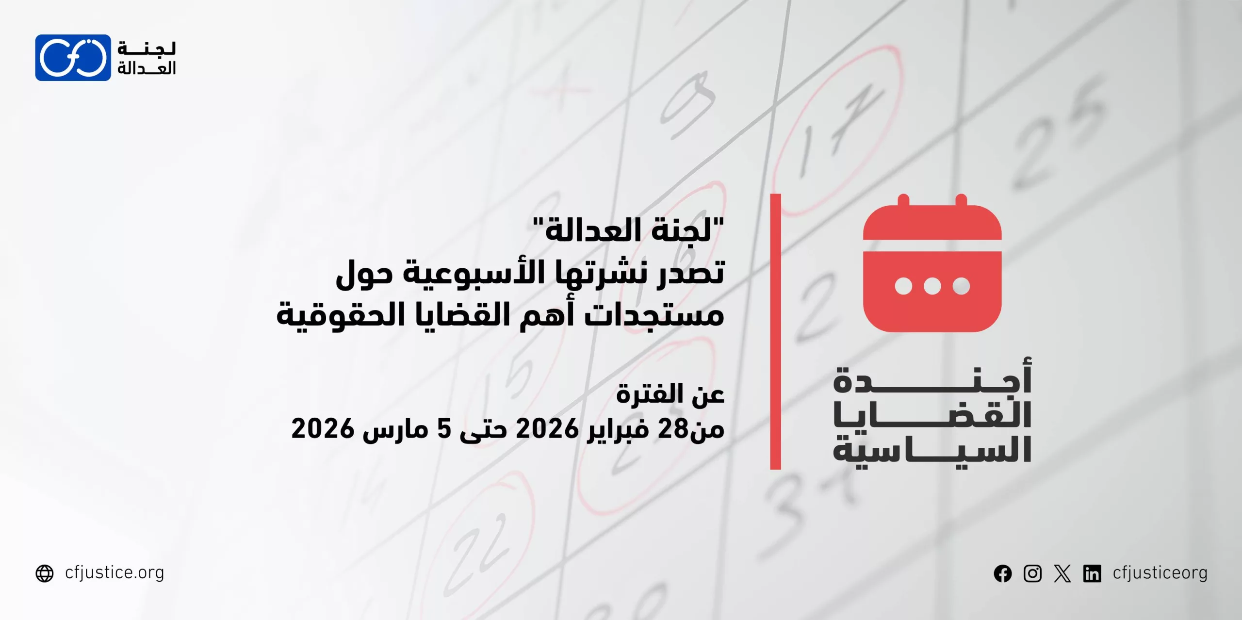 في إطار متابعتها المستمرة للوضع القانوني المرتبط بالقضايا الحقوقية الهامة في مصر، تصدر “لجنة العدالة” نشرتها الأسبوعية الخاصة بمستجدات أهم القضايا في الأسبوع، والمنشورة عبر أجندتها للقضايا السياسية، والتي دشنتها لتسهيل عملية البحث عن تواريخ انعقاد جلسات القضايا الحقوقية وأحدث تطوراتها بشكل مبسط يسهل الوصول إليه، وذلك عن الفترة من 28 فبراير / شباط 2026 حتى 5 مارس / آذار 2026؛ والتي كانت كالآتي: