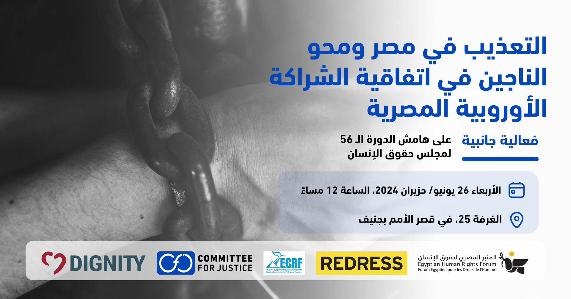 تعقد “لجنة العدالة” فعالية جانبية على هامش الدورة العادية السادسة والخمسين لمجلس حقوق الإنسان التابع للأمم المتحدة، بالتعاون مع “ديجنتي- الكرامة” و “ريدرس- الإنصاف” و “المفوضية المصرية للحقوق والحريات” و “المنتدى المصري لحقوق الإنسان”، حول التعذيب في مصر ومحو الناجين في اتفاقية الشراكة الأوروبية المصرية.