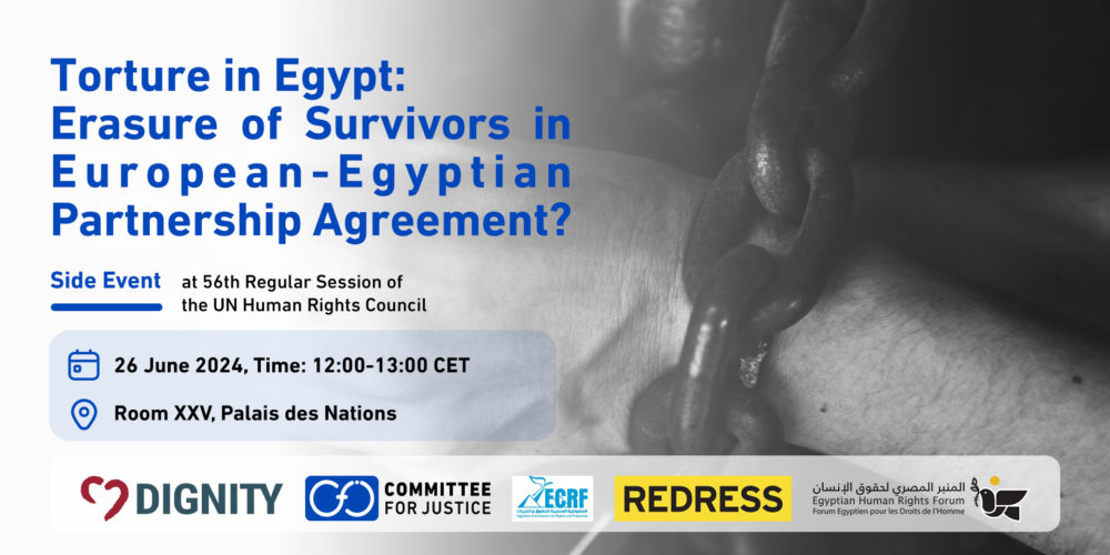 The “Committee for Justice” (CFJ) will host a side event during the 56th regular session of the UN Human Rights Council, in collaboration with “Dignity – Danish Institute Against Torture,” “Redress,” “Egyptian Commission for Rights and Freedoms,” and “Egyptian Human Rights Forum.” The event will address torture in Egypt and the erasure of survivors within the framework of the EU-Egypt Partnership Agreement.