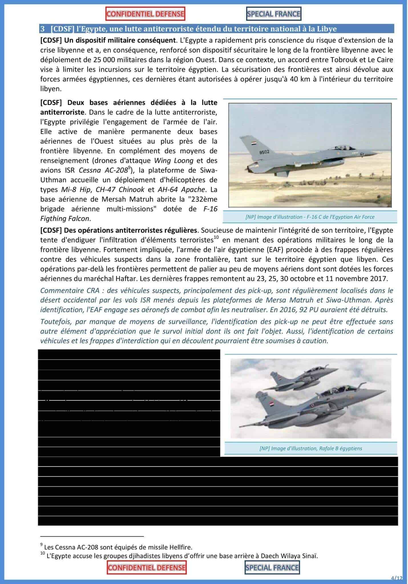وقال الوزير المصري إن “مهام طائرات المراقبة والاستخبارات الخفيفة (ALSR) [كانت] حاسمة في تحديد وتعيين العديد من الأهداف” وفقًا للتقرير الذي أشار إلى أن لودريان رد بـ “تقديره لمهارة ودقة طياري القوات الجوية المصرية”.